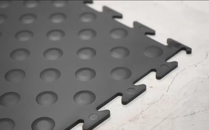 Durable and quick to install, these tiles have a studded surface, R10 slip rating, fire retardant rating Bfl-S1 and are available in Black, Graphite or Blue.