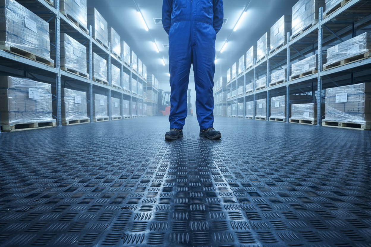 Premium checker plate rubber flooring for cold storage and industrial environments. Our heavy-duty checker plate flooring features raised diamond pattern, superior slip resistance, and excellent cold insulation - the trusted choice for cold storage facilities, freezers, and industrial applications across the UK.